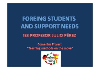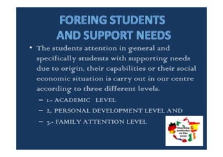 The document discusses support for foreign students and students with special needs at a school. It provides support across three levels: academic, personal development, and family attention. Support includes curriculum adaptations, academic support outside the classroom, language support classes, using technology in the classroom, homework clubs, tutoring, social skills workshops, guidance from the academic guidance department, problem-solving student groups, family follow-up, and parent education meetings. The goal is to help students from diverse backgrounds and with varying needs succeed academically and socially.