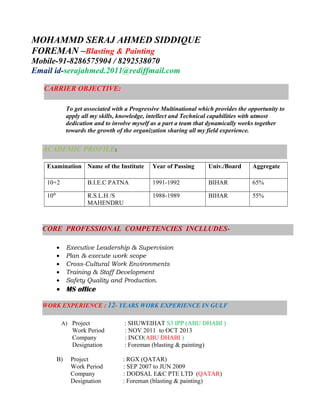 The document is a resume submitted by Mohammad Seraj Ahmed Siddique for a position as a foreman with experience in blasting and painting. It summarizes his educational qualifications including degrees from B.I.E.C Patna in 1991-1992 and R.S.L.H/S Mahendru in 1988-1989. It also outlines over 12 years of work experience as a foreman in blasting and painting for various projects in Abu Dhabi, Qatar, Jubail and Saudi Arabia between 1996-2013. His responsibilities included scheduling and overseeing blasting and painting work as well as implementing safety programs.
