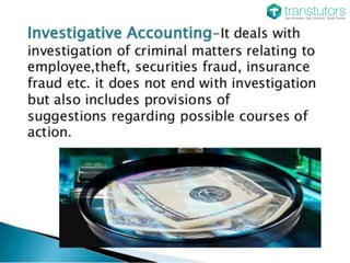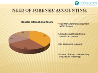 The document outlines the history and evolution of forensic accounting from its early days in 1931 to the establishment of the ACFE in 1988. It highlights the increasing demand for forensic accounting services due to significant losses from fraud, which cost organizations an average of 6% of their revenue. Forensic accountants conduct detailed investigations to uncover fraud and provide expert analysis in various areas, including damages and antitrust issues.