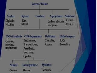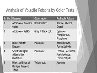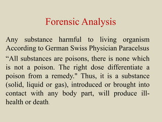 The document discusses methods for analyzing toxic substances and poisons. It describes: