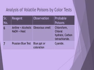 - Examples of tests used to detect common poisons like ethanol, barbiturates, DDT, and methods to analyze heavy metals like mercury and arsenic
