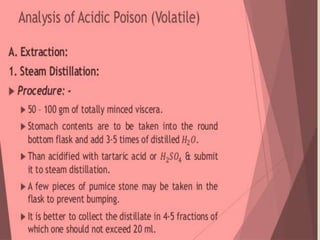 - Extraction methods used to isolate acidic, basic, volatile, and non-volatile poisons from tissues through use of solvents and acid-base reactions.