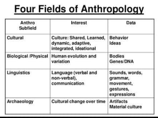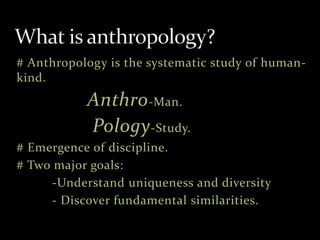 Anthropology is the systematic study of humankind. Forensic anthropology involves the examination of human remains to identify individuals and determine cause of death. It can provide biological profiles, help distinguish trauma timing, and match remains to missing persons cases. New applications include using 2D images to identify suspects, 3D facial modeling, and assessing images for age in legal cases.