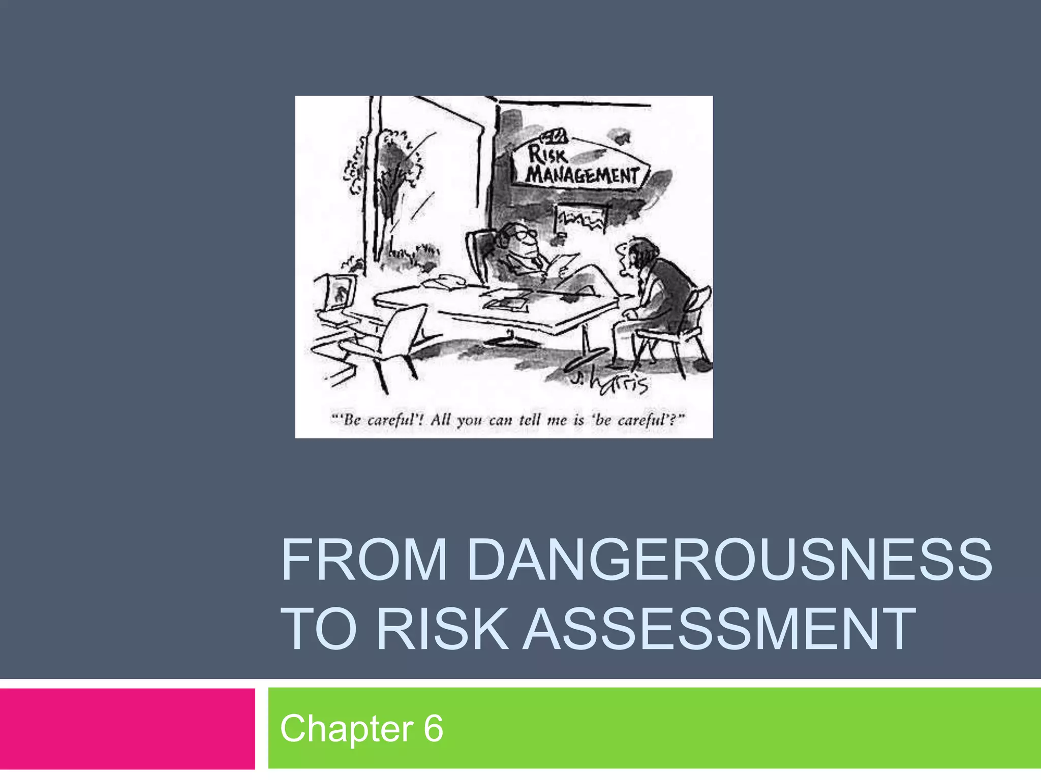 This document discusses risk assessment and the prediction of dangerousness and violence. It covers 3 types of predictive schemes and notes the first generation of research found mental illness alone did not predict violence accurately. Later research focused on risk factors to assess risk with moderate accuracy. Prediction of specific types of violence like sexual offending, domestic violence, child abuse, and suicide were also discussed. Guidelines, tools, and statistics related to predicting and preventing these events were provided.
