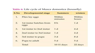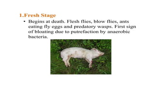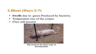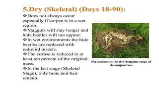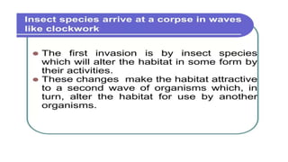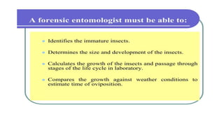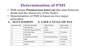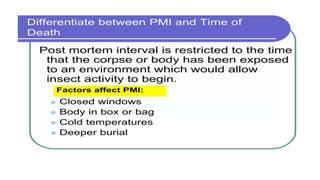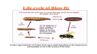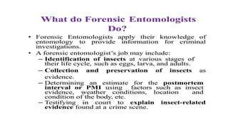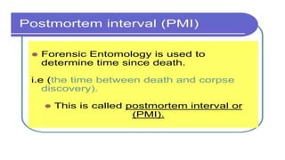 This document discusses forensic entomology and its use in estimating the post-mortem interval (PMI). It covers the divisions of forensic entomology including urban, stored-product, and medico-legal. Historical perspectives are provided. Methods for using insect evidence to estimate PMI are described, including examining larval development stages, fly life cycles, succession patterns of insects, and examining larval weights and developmental patterns under controlled conditions. Factors that can affect insect growth rates are also discussed.