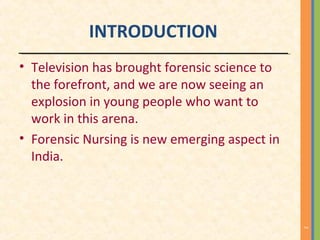 This document discusses the emerging field of forensic nursing in India. It defines forensic nursing as the application of nursing sciences to legal proceedings, providing treatment to victims and perpetrators of violence, abuse, accidents, and disasters. The scope of forensic nursing is described, including documenting injuries, collecting evidence, assisting in investigations and legal cases, and working in hospitals, correctional facilities, and disaster response. The key roles and responsibilities of forensic nurses are collecting evidence from victims in a way that does not compromise safety or evidence integrity, performing comprehensive forensic examinations, meticulous documentation, and evidence preservation depending on the type of material.