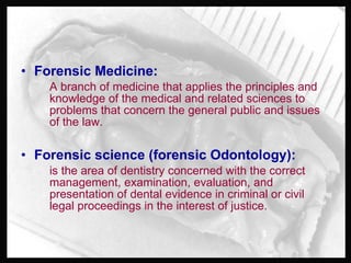 Forensic odontology is a branch of forensic science that applies dental knowledge and techniques to legal investigations. Forensic dentists are responsible for identifying human remains, creating dental profiles, estimating age, analyzing bite marks, and assessing abuse cases. They identify remains by comparing dental records, produce profiles with information like sex, race and socioeconomic status, estimate age using tooth development charts, and analyze bite marks by comparing wounds to a suspect's teeth molding.