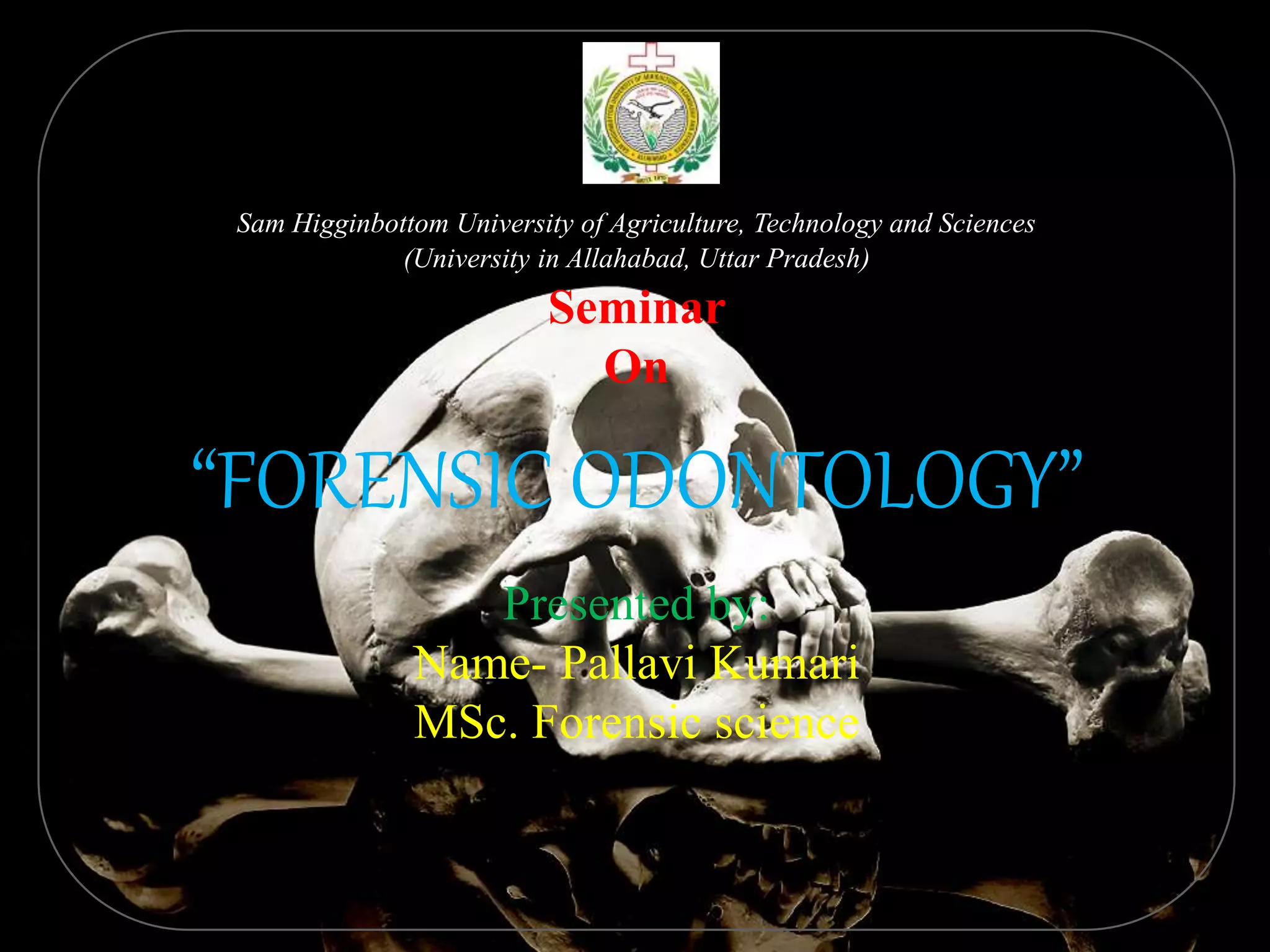 The seminar on forensic odontology, presented by Pallavi Kumari at Sam Higginbottom University, covers the definition and historical context of forensic odontology, along with identification methods and their applications in criminal cases. It discusses the scientific validity of dental identifiers, age estimation techniques, and the role of dental evidence in mass disaster situations. Additionally, the document highlights bite mark analysis and its relevance in forensics, emphasizing the importance of dental records in the identification of individuals.