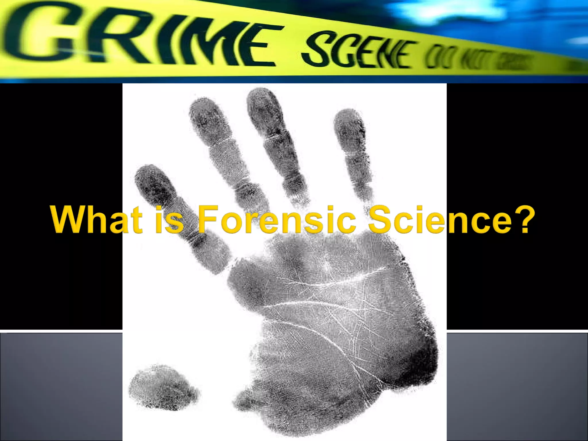 Forensic science is the application of science to matters of law. It examines physical evidence found at crime scenes to establish or disprove facts through scientific analysis using principles from fields like physics, chemistry, and biology. Forensic scientists present their expert findings and conclusions in court to aid legal proceedings.