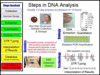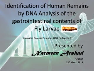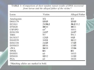 The document presents a forensic case report involving a badly burned female corpse, with key elements including the use of forensic entomology and DNA analysis for victim identification. The methodology described includes the extraction of DNA from maggots and buccal samples from an alleged father, alongside various DNA fingerprinting techniques such as PCR and capillary electrophoresis. The findings suggest a high probability of paternity testing and highlight the significance of entomological evidence in forensic investigations.