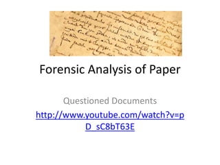 - Techniques like measuring thickness, texture, brightness, opacity, and analyzing watermarks can help forensic experts determine paper types and origins.