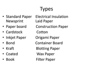 - Paper is made from wood and cotton fibers and often treated with additives that affect properties like color, strength, and brightness.