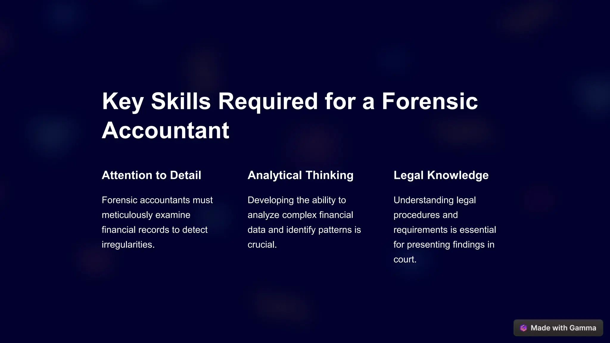Forensic accounting involves applying accounting and investigative skills to uncover fraud and financial irregularities. It plays an important role in legal cases and corporate investigations. Forensic accountants must meticulously examine financial records, think analytically to identify patterns, and have a strong understanding of legal procedures to present findings effectively. They investigate issues like embezzlement, fraudulent financial reporting, and money laundering using techniques such as digital forensics, data analytics, and audits. Forensic accountants also provide expert testimony and help legal teams by advising on financial matters and case preparation. The field offers competitive salaries and high projected job growth.