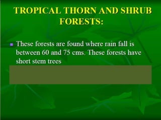 This document provides an overview of physical forestry resources. It begins by defining what a forest is as a community of trees, shrubs, herbs and other plants that cover a considerable area. It then discusses the different types of forests found around the world, including tropical evergreen forests and mangrove forests. The document outlines the structure and importance of forests, noting they regulate temperature, prevent soil erosion, and provide habitat for wildlife. It also discusses threats to forests like deforestation and provides suggestions for forest conservation and ways individuals can help protect forests.