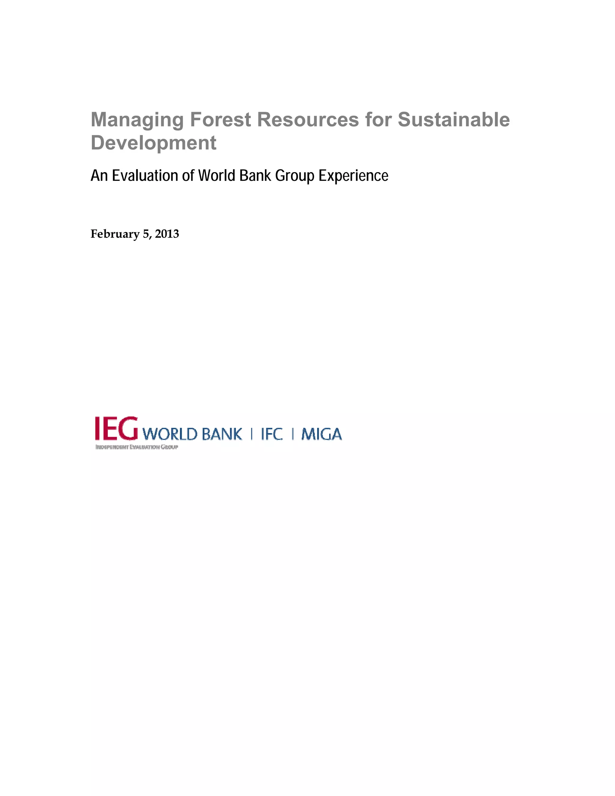 This document provides an evaluation of the World Bank Group's implementation of its 2002 forest strategy over the past decade. It finds that the strategy has effectively shifted support toward protecting forests in Africa and dry forest regions through approaches like protected areas, payments for environmental services, participatory forest management, and sustainable land management. However, it notes that projects could better integrate climate change considerations and measure biodiversity outcomes. The evaluation also examines the International Finance Corporation's investments and advisory services in support of sustainable forestry and finds they have contributed to economic development but need better environmental monitoring. It concludes that while the strategy achieved much, partnerships need stronger links to Bank operations and greater collaboration within the World Bank Group is still needed.