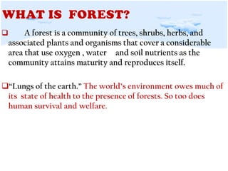 Forests cover nearly half of the Philippines and provide many benefits such as preventing soil erosion, promoting rainfall, and maintaining air quality. However, forests are being destroyed through logging, farming, fires, and development. Conservation efforts include protected areas, reforestation, and laws against illegal logging. Forests are important to conserve due to their economic and environmental roles.