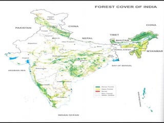 2. India has a variety of forest types ranging from tropical wet to dry deciduous to alpine forests. However, deforestation has reduced forest cover to only 21.02% of the country's area.