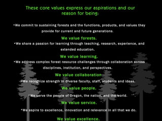 This document provides information for students in the College of Forestry at Oregon State University. It introduces the college's core values of valuing forests, learning, collaboration, people, service, and excellence. It then lists college leadership and departments. The rest of the document provides guidance on resources available to students, scholarships, involvement opportunities, academic advising, policies and procedures, important dates, and contacts for additional help.