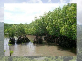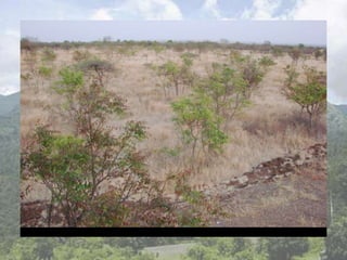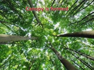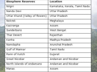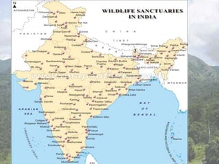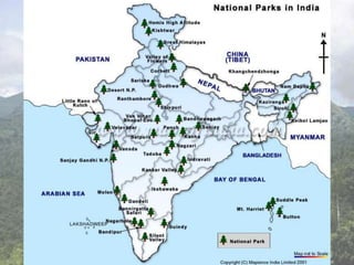 This document provides information on the different types of forests found in India. It discusses 6 main types of forests - tropical evergreen forests, deciduous monsoon forests, tropical grasslands, mangrove forests, desert forests, and alpine forests of the Himalayas. Each forest type is described in terms of location, climate, and dominant plant species. The document also discusses the importance of forests, methods of forest conservation, wildlife found in India, and protected areas like wild sanctuaries and national parks that help conserve forests and wildlife.
