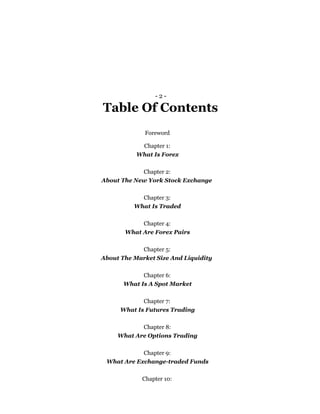 The document outlines the terms and conditions related to a forex trading report, emphasizing the unguaranteed accuracy of the information due to the fluid nature of the internet. It provides a comprehensive overview of forex trading, including its definitions, functions of major platforms like the New York Stock Exchange, trading strategies, and the intricacies of market mechanics. Additionally, it warns readers about the inherent risks, advising caution and professional guidance in trading practices.