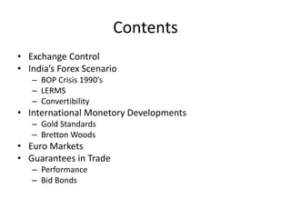 1) The document discusses various topics related to foreign exchange including exchange control in India, problems with foreign exchange, Eurocurrency markets, and their operation and effects.
