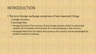 The document provides an overview of the foreign exchange (forex) market. It discusses key terms like foreign currency and exchange rate. The forex market allows participants to buy and sell currencies and includes banks, investment firms, central banks, and retail investors. It is the largest financial market in the world by trading volume. The main segments are the spot market for immediate exchanges and forward market for exchanges at a future date. Major participants include commercial banks, brokers, central banks, and multinational companies. The forex market facilitates international trade and investment by transferring purchasing power across countries and setting currency prices.