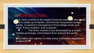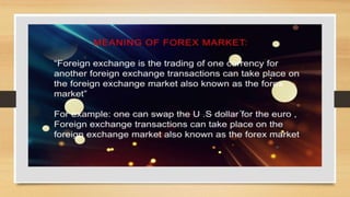 The document discusses different types of foreign exchange markets. The retail foreign exchange market involves dealings between banks and customers or brokers and customers. It includes both full-fledged money changers and restricted money changers. The wholesale foreign exchange market involves dealings between banks, including interbank and between central banks and other banks. Derivatives contracts derive their value from an underlying security traded in foreign exchange markets. The forex market plays an important role in determining economic growth and development globally.