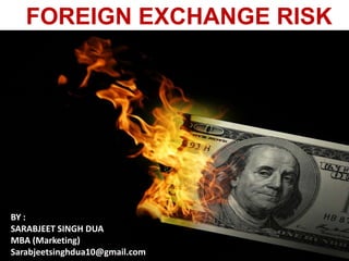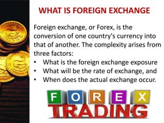 This document discusses foreign exchange risk and its management. It defines foreign exchange as the conversion of one currency to another, which poses risks from exchange rates and timing. Risk management involves identifying and mitigating uncertainty in investments. Foreign exchange risk specifically refers to unanticipated changes in exchange rates that can harm multinational businesses and investors. There are four main types of foreign exchange risk exposures: transaction, economic, translation, and contingent. The document also briefly discusses measuring financial risk and conditions where foreign exchange risk is irrelevant.