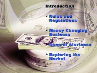 This document provides information on foreign exchange money changing and regulations in India. It discusses the factors that affect exchange rates, the types of entities authorized to deal in foreign exchange, and the rules regarding purchasing, selling, and transporting foreign currency. It also outlines the various reports that must be filed related to foreign exchange transactions.