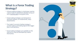 A forex trading strategy is a technique used by traders to determine when to buy and sell currency pairs based on technical analysis, fundamentals, or developed trading signals. Effective strategies include selecting markets, establishing entry and exit points, determining position size, and developing trading tactics. Traders should evaluate whether a strategy remains profitable and suited to current market conditions, and be willing to modify or change strategies when necessary to maintain effectiveness.