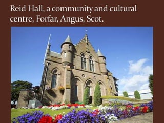 Forfar is a town in Angus, Scotland that serves as the administrative center for Angus Council. It has a population of around 13,500. Notable features include Forfar Loch Country Park, which is popular for walking, and its proximity to scenic areas like Glen Doll. The town's economy relies on agriculture and tourism. It is also known for the traditional Forfar bridie pastry.