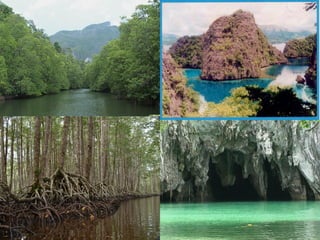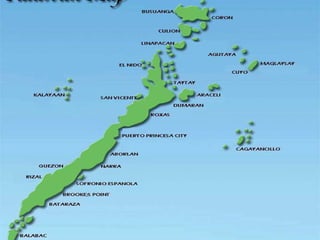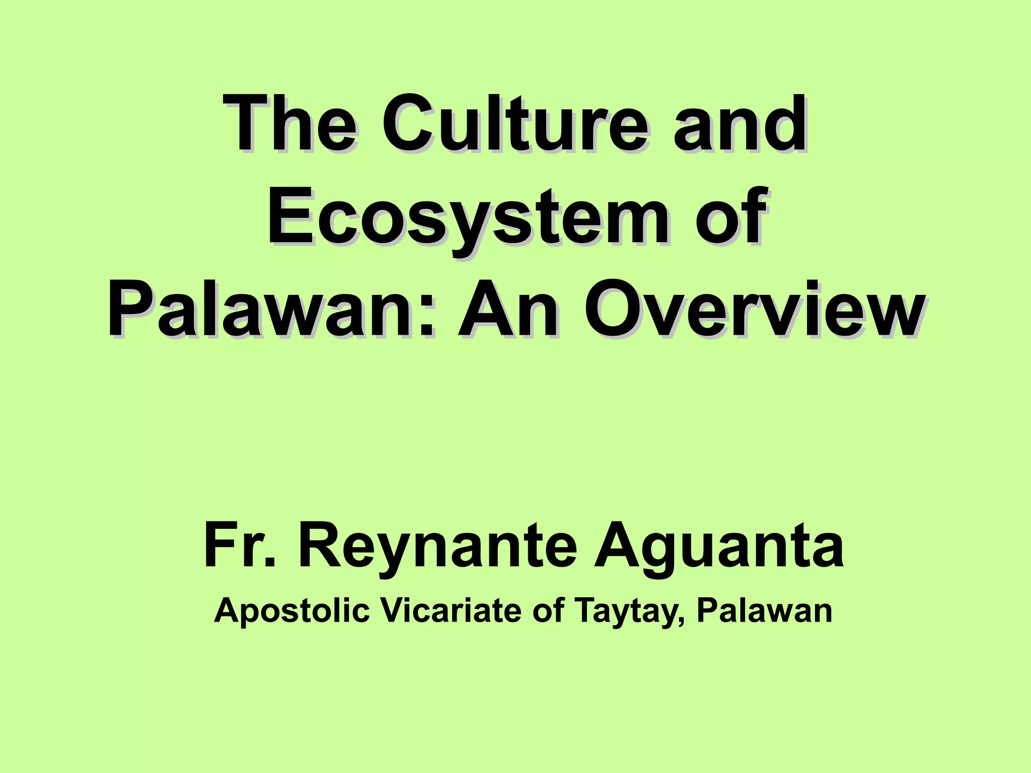 The document provides an overview of the culture, ecosystem, and biodiversity of Palawan island in the Philippines, as well as current threats. Some key points: