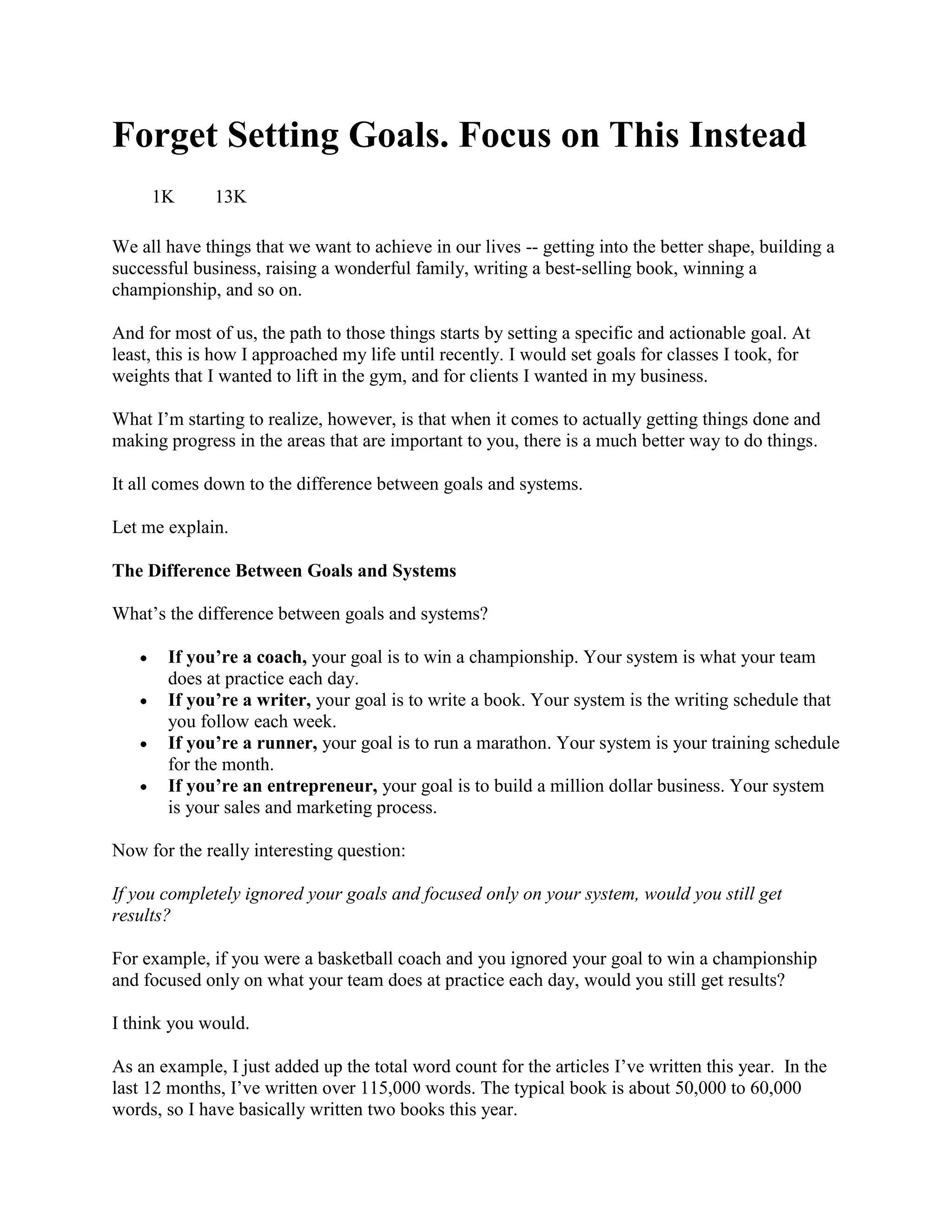 The document discusses focusing on systems instead of goals for long-term progress. It argues that goals can reduce happiness by delaying satisfaction until the goal is reached, lead to lack of motivation after the goal is achieved, and suggest an ability to control unpredictable outcomes. In contrast, systems involve committing to consistent daily or weekly processes that produce results even without specific goals. The author provides examples of writing a daily article and sticking to a workout schedule as systems that led to completing two books and physical improvements without setting those exact goals.