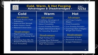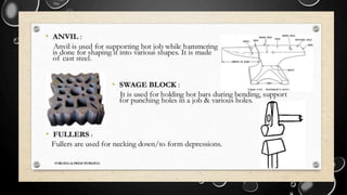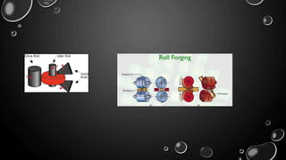 Forging is a metalworking process that uses compressive forces to shape materials by plastic deformation. It is carried out either hot or cold. The material is heated and shaped by hammer blows or presses. It produces stronger parts than casting or machining due to improved grain structure and lack of defects. Common forging applications include bolts, gears, crankshafts, and connecting rods. Forging can be classified by loading type, operating temperature, or die arrangement and involves steps like heating, shaping, heat treatment, and inspection.