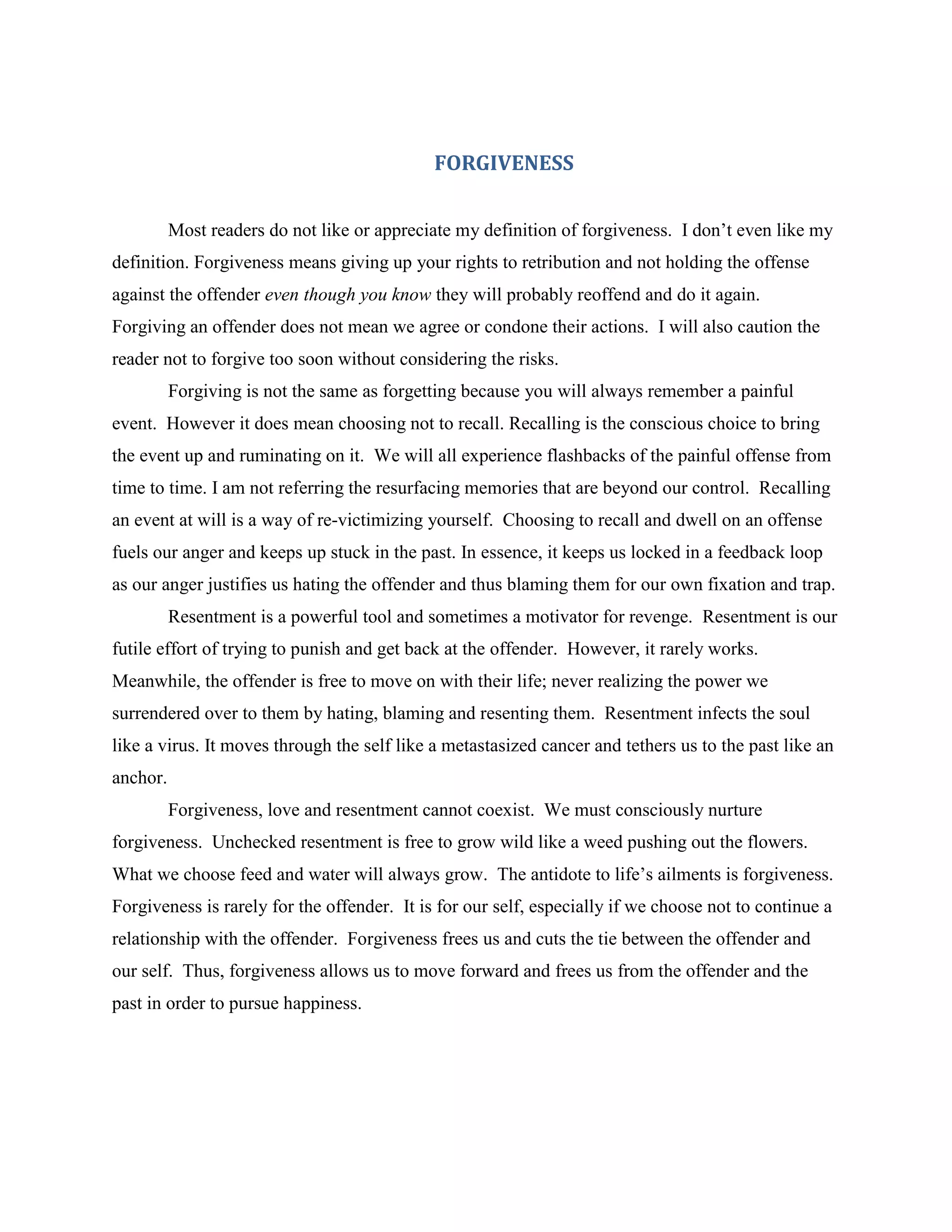 The document provides a definition of forgiveness as relinquishing the right to retribution and choosing not to harbor resentment towards an offender, even if they may offend again. It emphasizes the detrimental effects of resentment, describing it as a self-inflicted trap that hinders personal growth and happiness. The author outlines a 10-step process for forgiveness that encourages individuals to acknowledge their pain, separate the person from their actions, and focus on personal healing and moving forward.