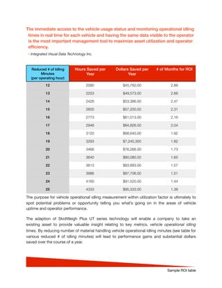 This document discusses the potential cost savings from reducing idling time of lift trucks. It provides a table showing the estimated hours and dollars saved per year and the return on investment period from reducing idling by 6-25 minutes per operating hour. Adopting a vehicle monitoring system called SkidWeigh Plus UT would provide insights into idling times and opportunities to improve performance and efficiency, saving substantial costs over the course of a year. Real-time visibility of vehicle usage status and idling times is an important management tool.