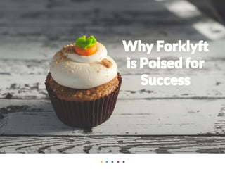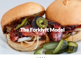 This document provides information about Forklyft, an app that enables users to save recipes from social media influencers, generate shopping lists for the recipes, and order the ingredients for delivery. It outlines Forklyft's value propositions for users, influencers, and retailers. It also provides details on Forklyft's leadership team and their roles, as well as Forklyft's business model, growth strategy, and competitive landscape.