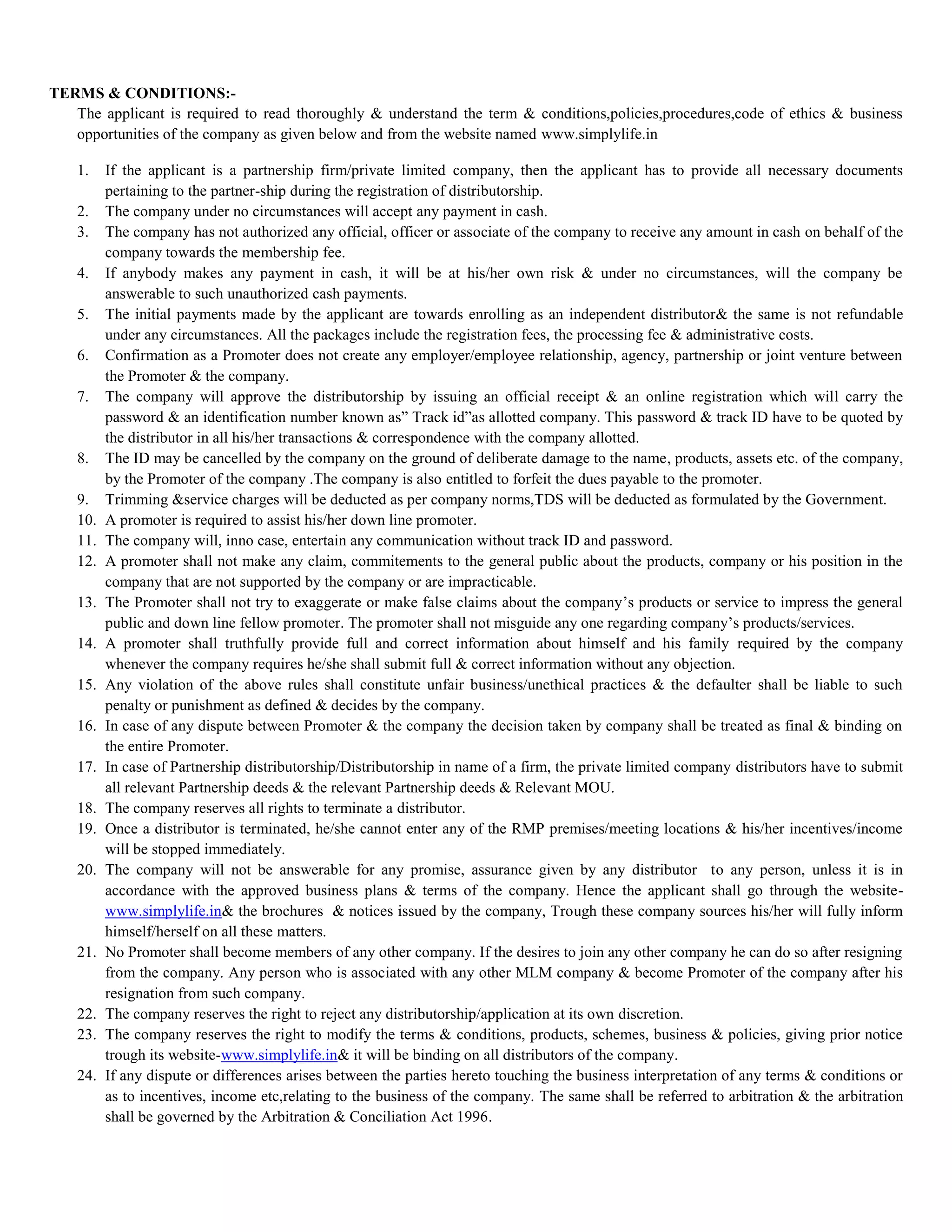 This document appears to be an application form for Simplylife Ventures Pvt. Ltd. It requests the applicant to fill in their personal and bank details. It also has sections for nominee information, referral information, and payment details. The last page outlines the terms and conditions of becoming a distributor for the company.