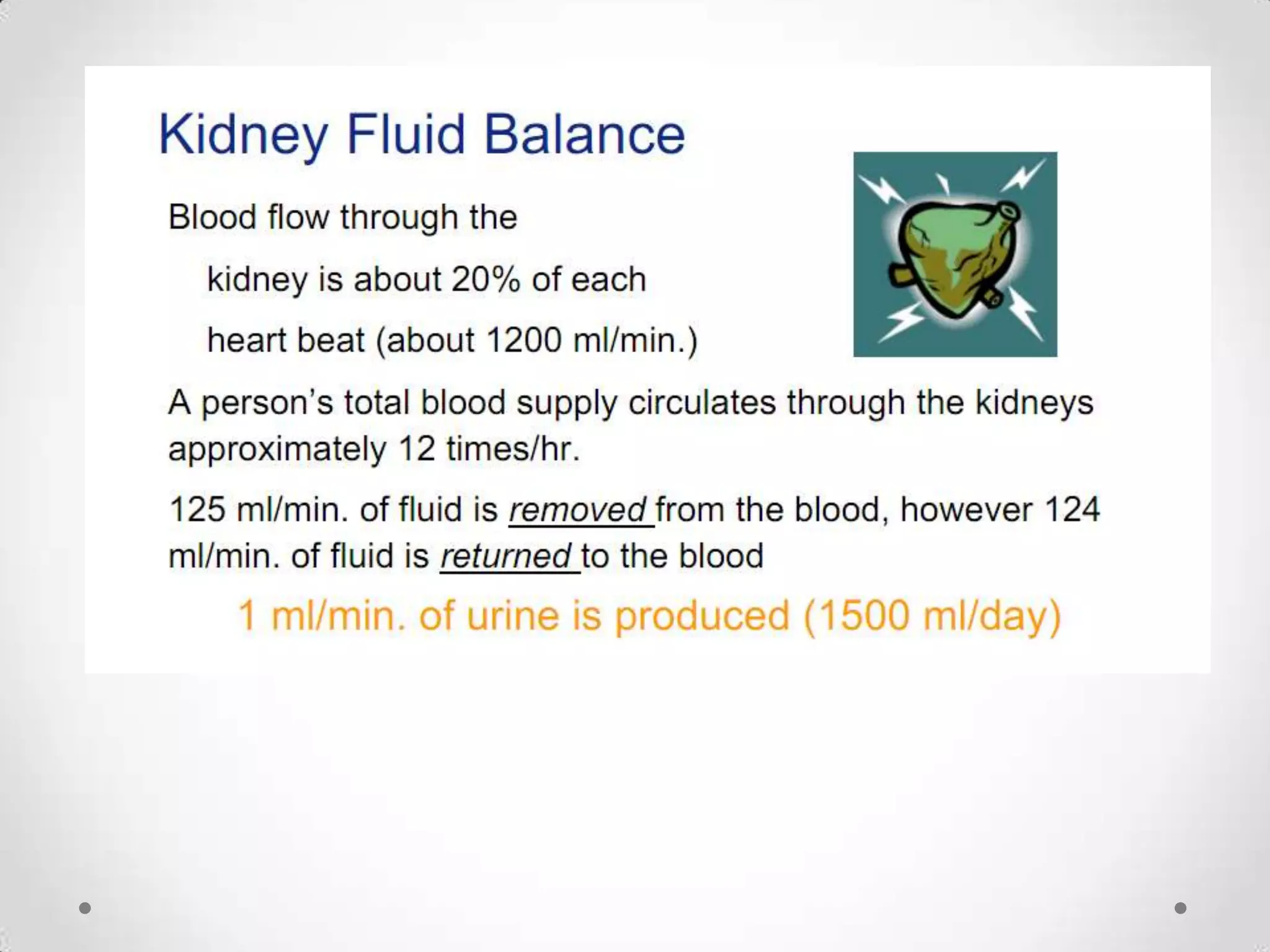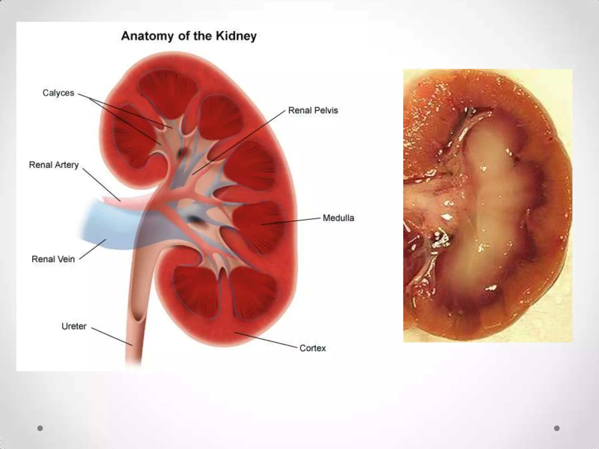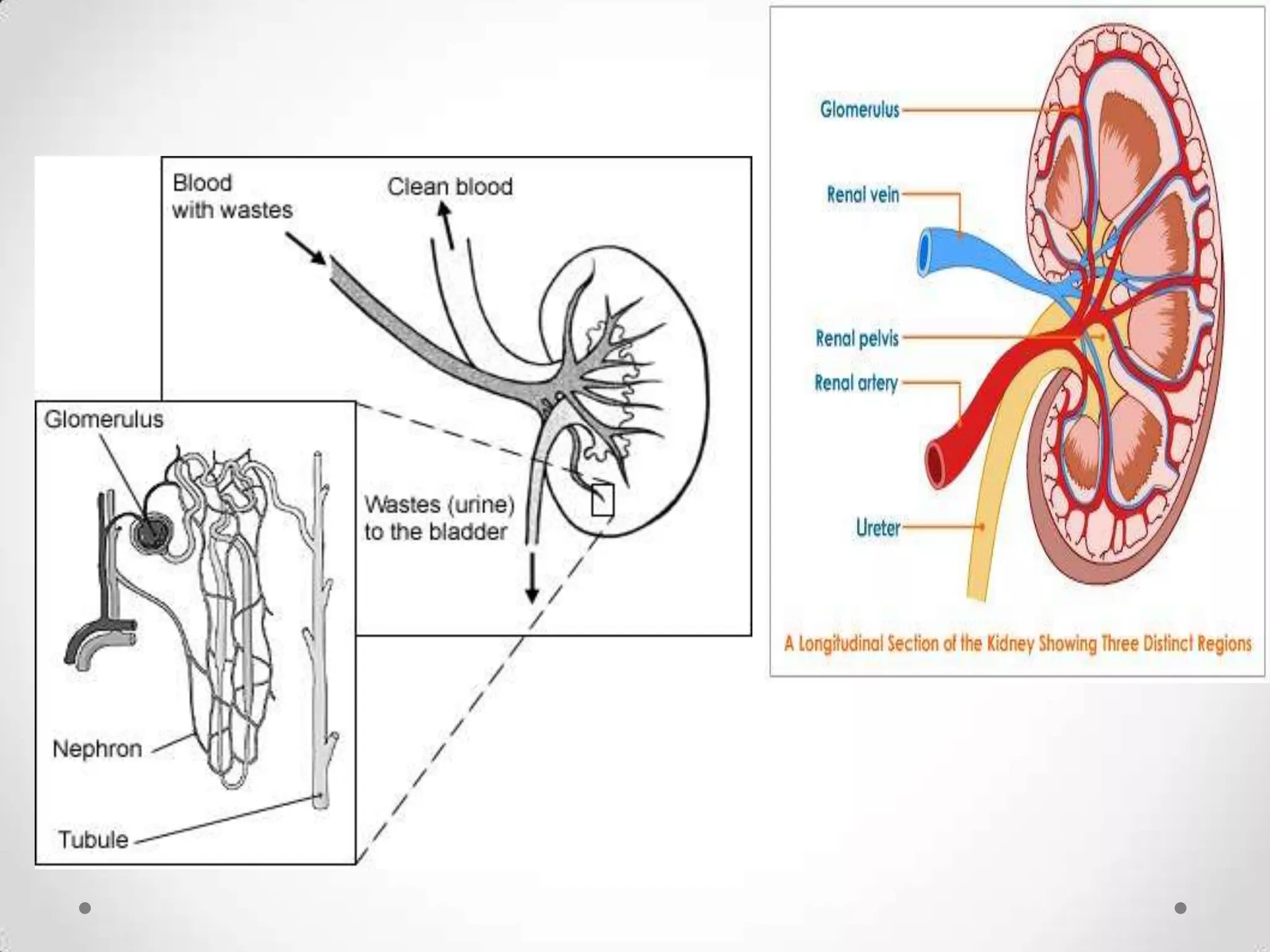 The kidneys filter waste from the blood and regulate water and electrolyte balance. They remove urea, uric acid, and creatinine. The kidneys are supplied by blood from the renal arteries and drain into the ureters. They filter minerals, sugars, amino acids and waste from the blood and reabsorb useful substances while excreting waste like urea in the urine. Kidney failure requires dialysis or transplant to filter the blood.