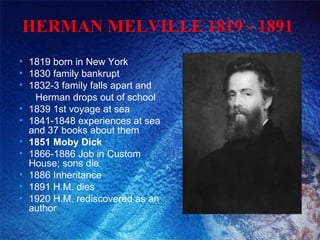 The document provides biographical information about author Herman Melville and summarizes his novel Moby Dick. It discusses Melville's life experiences, including his time at sea that inspired Moby Dick. The summary then outlines the key plot points and chronology of events in Moby Dick, including Captain Ahab's obsession with hunting and killing the whale Moby Dick which ultimately causes his ship to sink. The main characters of Ishmael, Ahab, and Moby Dick are also introduced.