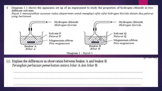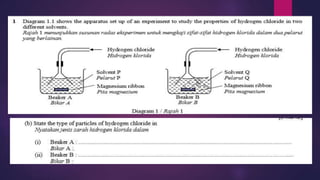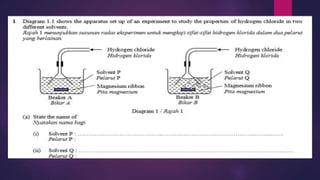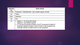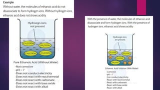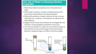 The document discusses acids and bases. It defines acids as compounds that ionize in water to produce hydrogen ions, and bases as compounds that react with acids to produce salts and water. Alkalis are bases that ionize in water to produce hydroxide ions. Water is necessary for acids and alkalis to exhibit their properties, as it allows them to dissociate into ions. The document also outlines the chemical properties of acids and bases, such as their reactions with each other, metals, and carbonates to produce salts, water, hydrogen gas or carbon dioxide. Common uses of acids and bases in daily life are also mentioned.