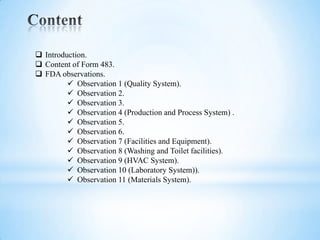The document outlines FDA inspection results at Ranbaxy Laboratories' Indian plant, revealing multiple quality and compliance failures leading to a U.S. import ban, affecting over 40% of the company's sales. Key observations highlight inadequate quality systems, insufficient investigations into discrepancies, and a lack of adherence to good manufacturing practices, resulting in a significant drop in stock value. The FDA's Form 483 cites numerous violations, including poor process controls and failure to address equipment and facilities issues.