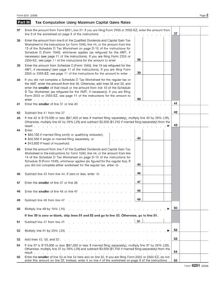This document is Form 6251 for calculating alternative minimum tax for individuals. It contains instructions for calculating alternative minimum taxable income by making adjustments to regular taxable income, such as adding back certain deductions and accounting for differences between regular and AMT depreciation. It then calculates tentative minimum tax by applying tax rates to alternative minimum taxable income and makes comparisons to regular tax to determine alternative minimum tax owed.