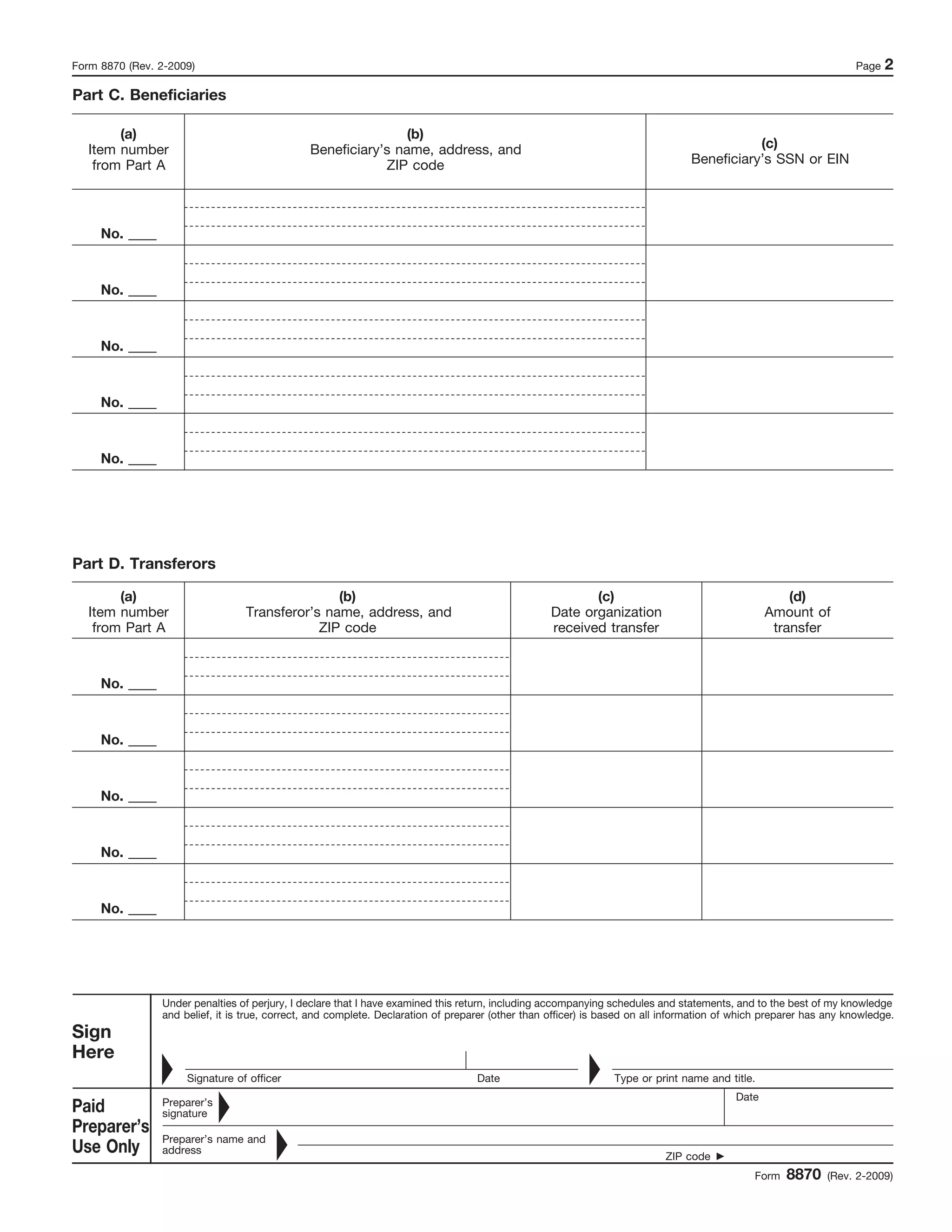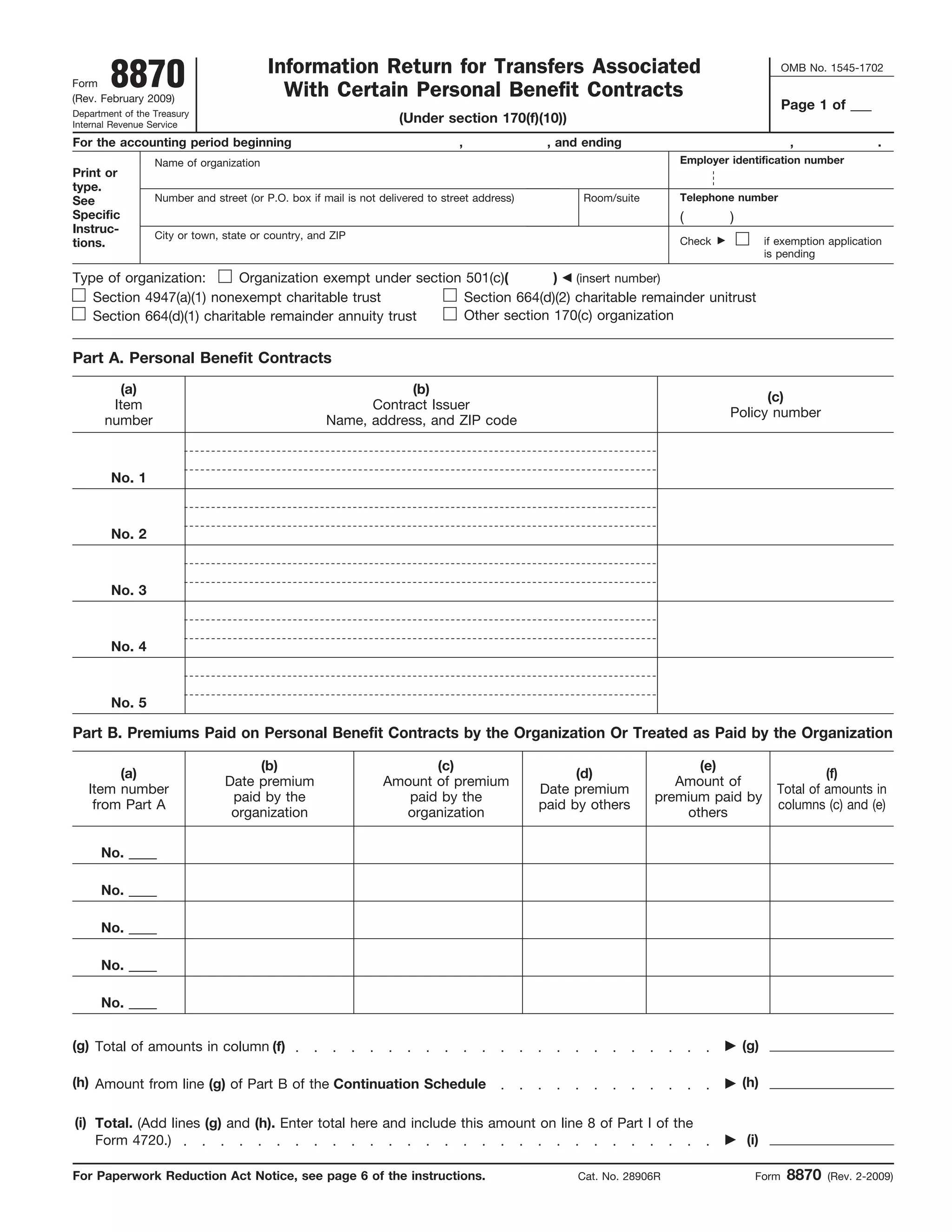 This document is an IRS Form 8870 that is required to be filed by certain charitable organizations. It provides information about personal benefit contracts for which the organization paid premiums or received transfers during the tax year. The form requires the organization to provide details in Parts A through D, including the contract issuer and policy number (Part A), premiums paid (Part B), beneficiaries (Part C), and transferors (Part D). Additional continuation schedules can be attached if more than five contracts need to be reported.