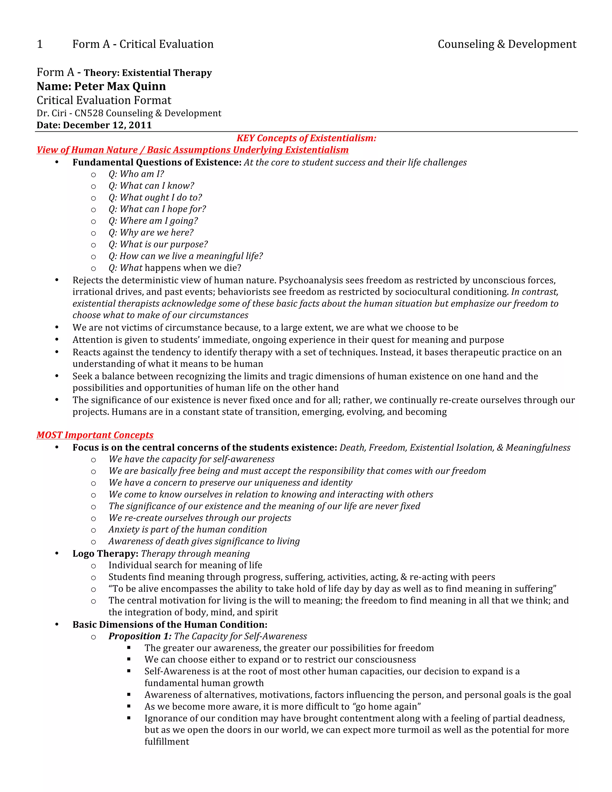 The document is a critical evaluation of existential therapy in the context of counseling and development, focusing on key concepts such as the nature of human existence, freedom, responsibility, and the search for meaning. It emphasizes the importance of self-awareness, authenticity, and the therapeutic relationship as students navigate their personal challenges. The document outlines therapeutic goals and techniques while also considering the applicability of existentialism in multicultural contexts and its strengths and limitations in student affairs.