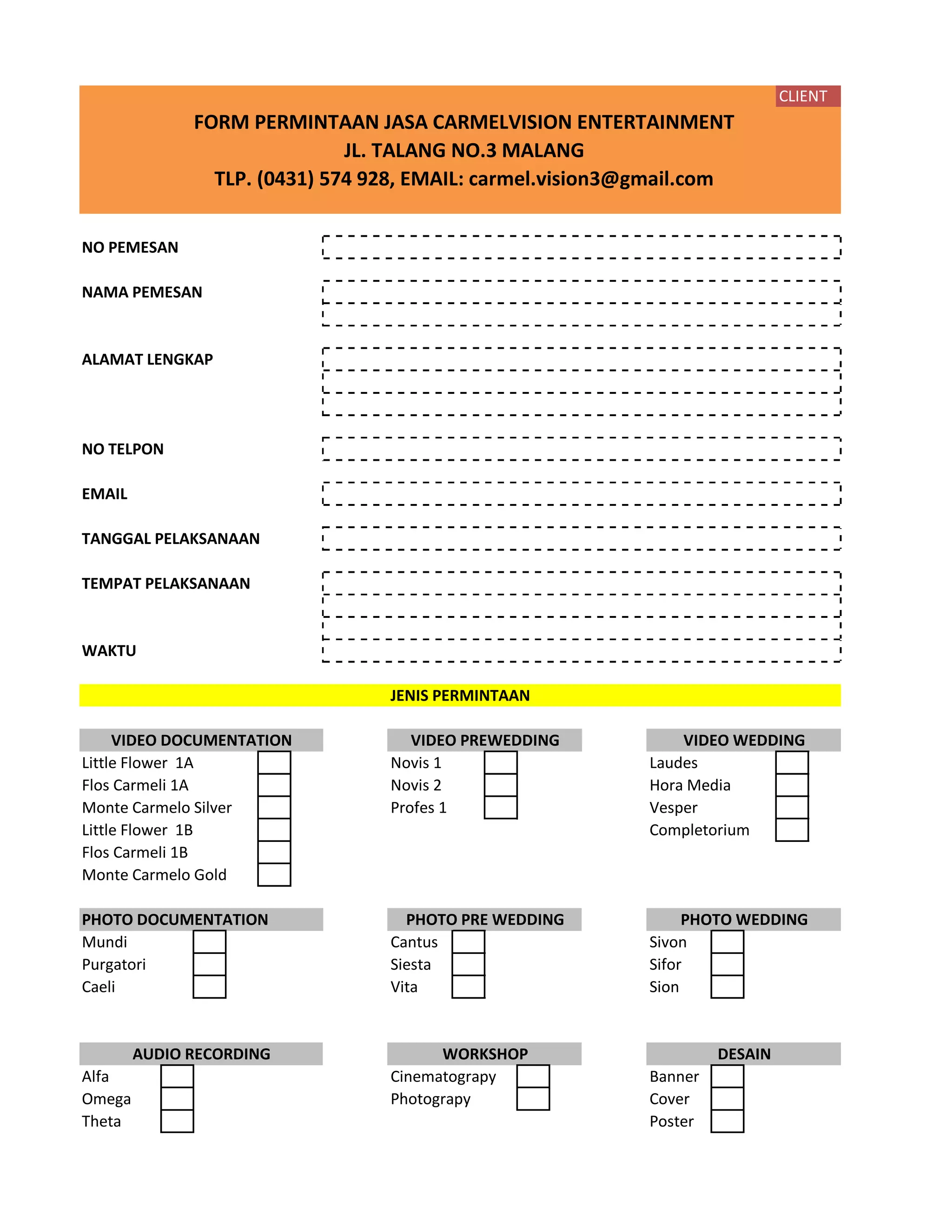 The document details a client request for various multimedia services including video documentation and photography for wedding and pre-wedding events. It lists the client's personal and contact information along with specific services requested and the provider's contact details. Carmelvision Entertainment is identified as the service provider located in Malang.