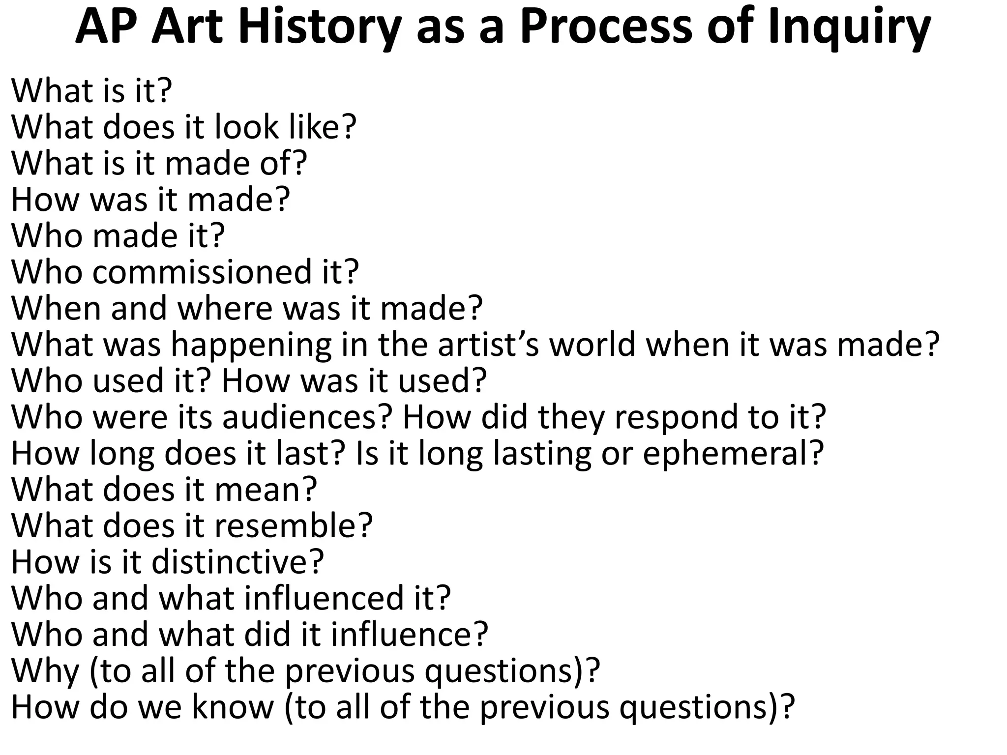 Art history students analyze works of art by describing their visual elements and form while utilizing resources to investigate techniques, meanings, and historical contexts. They seek evidence to strengthen their analysis, transforming descriptions into explanations for why works appear as they do. Students consider an artwork's materials, creator, audience, function, symbols, messages, and the relevant cultural forces during its creation.