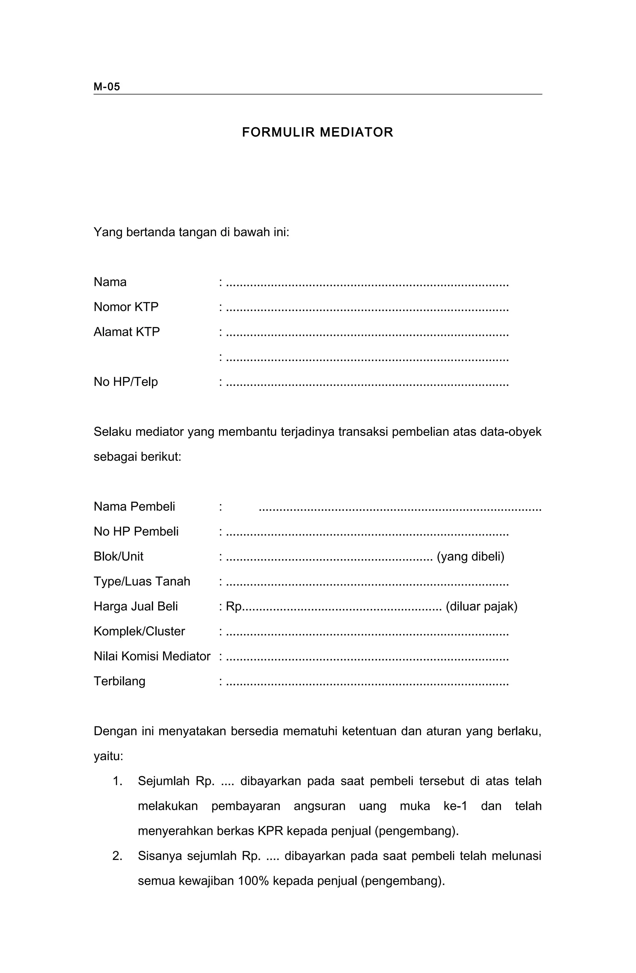 Dokumen ini adalah formulir mediator yang mencatat informasi tentang transaksi pembelian properti, termasuk detail pembeli, harga, dan komisi mediator. Mediator berkomitmen untuk mengikuti ketentuan pembayaran yang ditetapkan saat pembeli melakukan transaksi. Terdapat juga ruang untuk tanda tangan mediator dan saksi, serta informasi tambahan terkait transaksi.