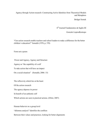 Bridget Somek explores how action research can enable teachers and school leaders to positively impact children's education. Somekh defines agency as "the capability of a self to take action that will have an impact on a social situation." The reflexivity at the heart of action research allows agency to empower an authentic self through practical actions. Examining human behavior at a group level through "dilemma analysis" can help identify conflicts between values and practices to find better alignments. A multi-self understanding recognizes that individuals develop a complete self through engagement with both their personal views and the perspectives of others in their community.