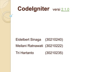 Dokumen ini menjelaskan tentang penggunaan CodeIgniter versi 2.1.0 sebagai framework PHP untuk membangun aplikasi web dinamis dengan pola MVC. Terdapat langkah-langkah konfigurasi untuk setting dasar, pembuatan model, dan pengaturan validasi form menggunakan fitur-fitur yang tersedia dalam CodeIgniter. Framework ini menawarkan kemudahan dalam pengembangan dan pemeliharaan aplikasi dibandingkan pengkodean dari awal.